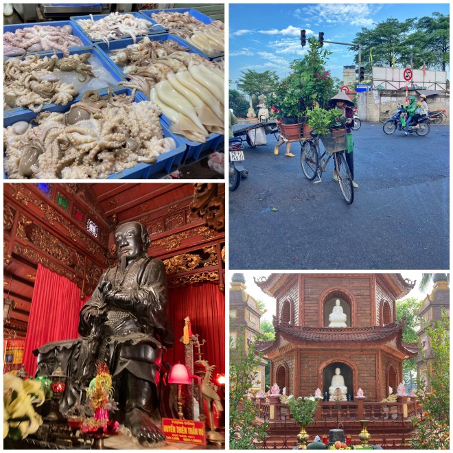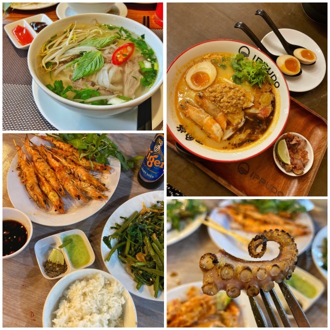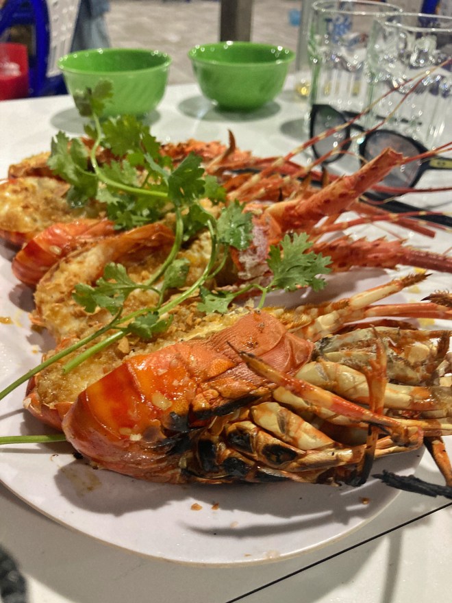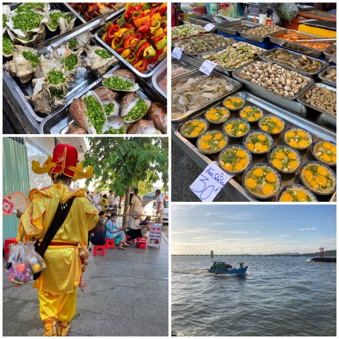 Včera odpoledne jsme se šli projít do centra cca 5 km odsud, něco popili a zkusili nějaké dobroty. Pečené marinované vepřové masíčko s rýží stejně vyhrálo nad mořskými potvorami 😁 můžete tu na místním nočním trhu zkusit různé druhy a velikosti mušlí, šneků, humrů, ryb, olihní, zkusili jsme i pečenou ježovku, ale není to žádná hitparáda 😁 už bych si dala ty knedlíky se zelím! Co je zajímavé tady ve Vietnamu je to, že to tu začíná žít od cca 5 hodiny večer a zpravidla to tu kolem 11 večer či půlnoci zase končí. Policie vyhlásí noční klid a čus bus!